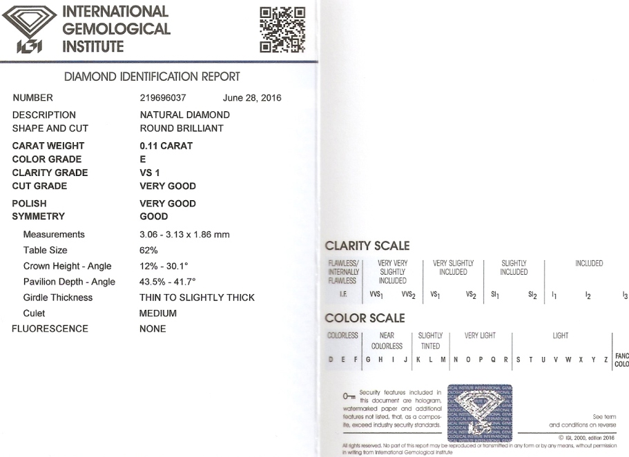 Diamant 0.11ct E/VS1 s IGI certifikátem