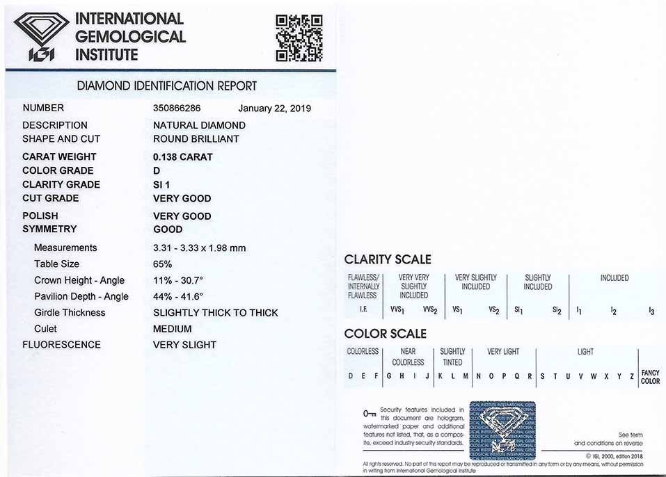 Diamant je včetně certifikátu IGI a je zataven do plastové kartičky IGI.