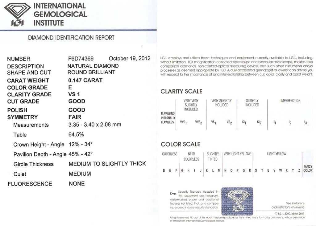 Diamant 0.147ct E/VS1 s IGI certifikátem