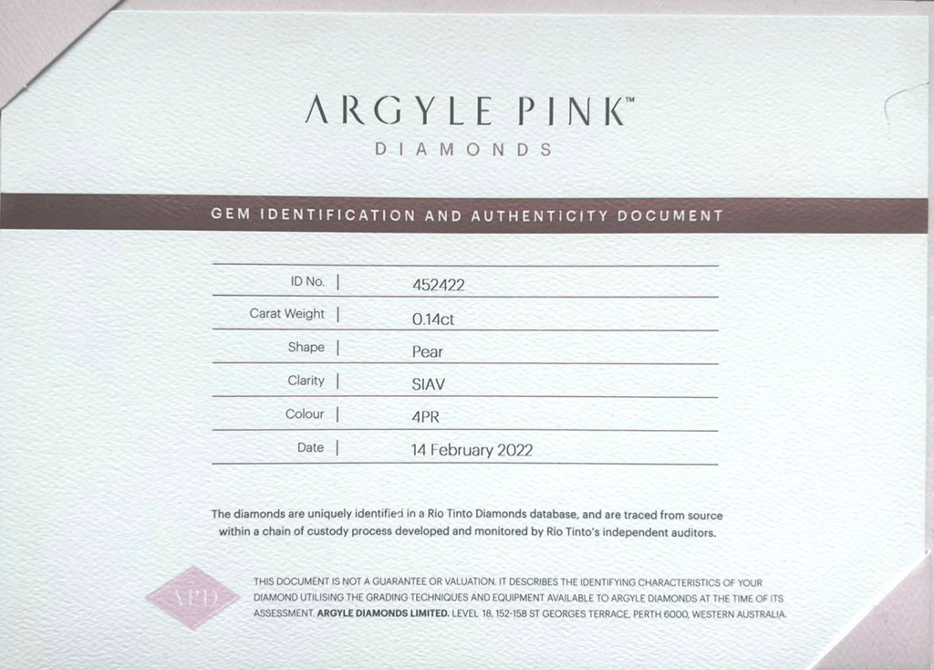 Certifikát ARGYLE je vystaven přímo diamantovým dolem v Austrálii, kde byl diamant vytěžen. Diamant je laserově číslován na své rundistě dolem ARGYLE.