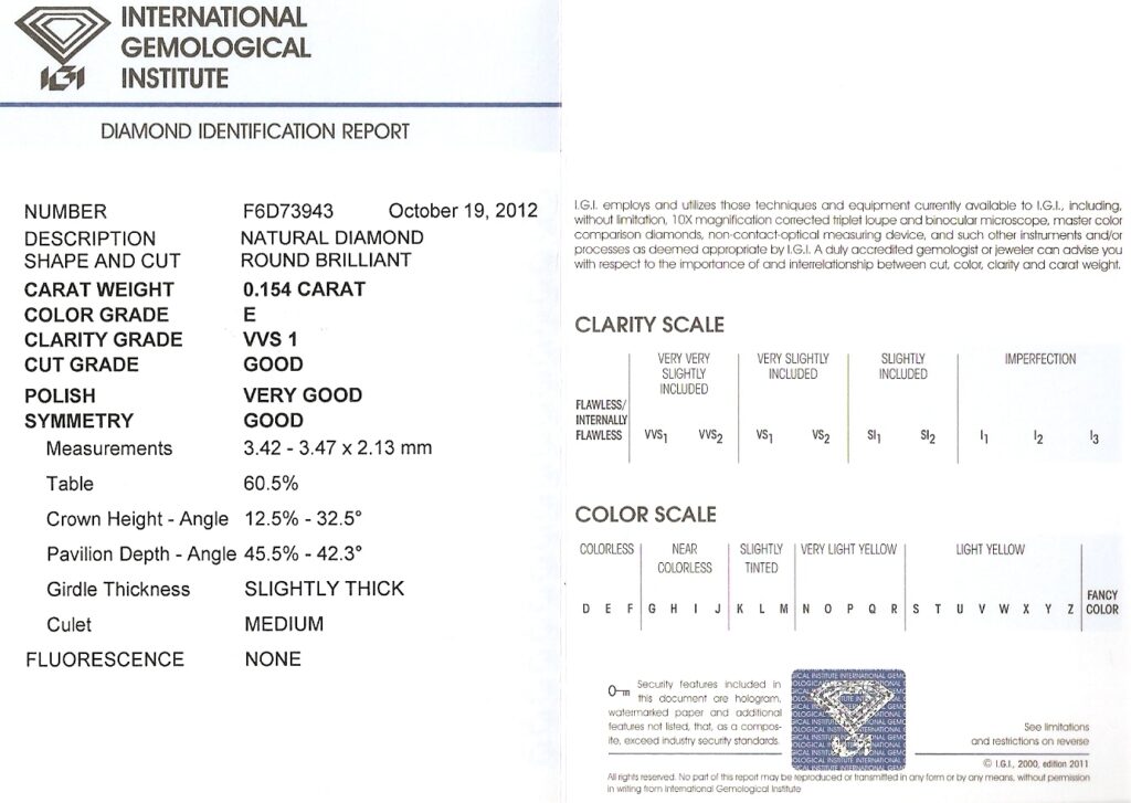 Diamant 0.154ct E/VVS1 s IGI certifikátem