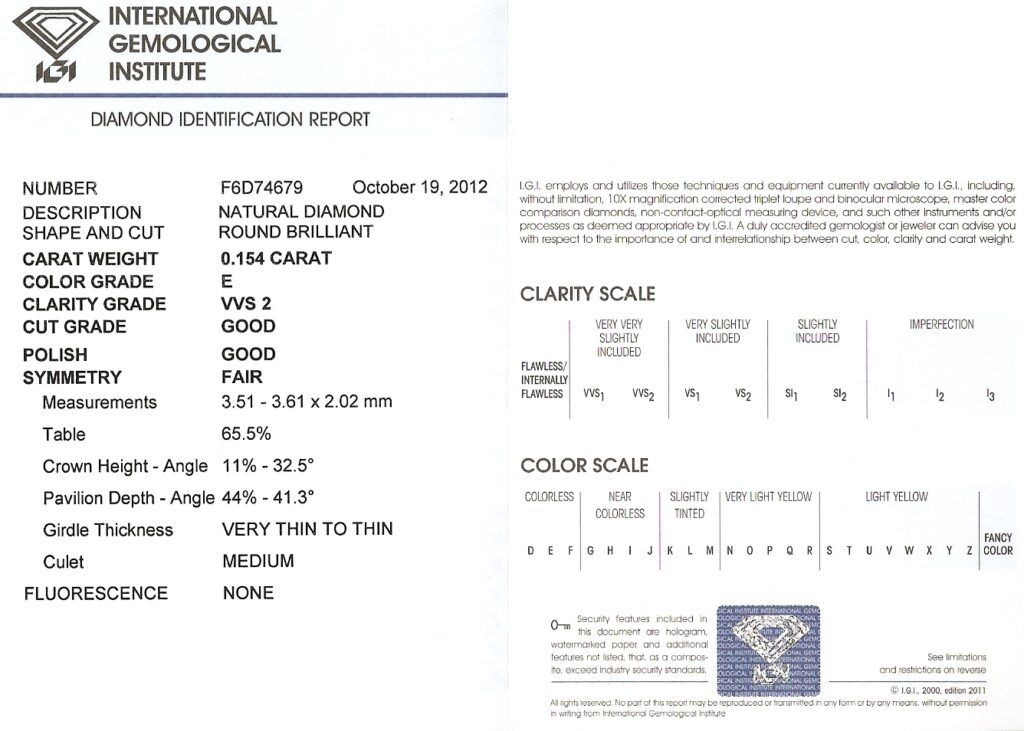 Diamant 0.154ct E/VVS2 s IGI certifikátem
