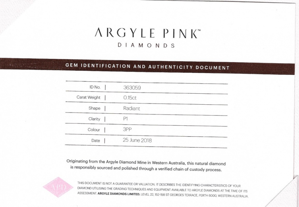 Certifikát ARGYLE je vystaven přímo diamantovým dolem v Austrálii, kde byl diamant vytěžen. Diamant je laserově číslován na své rundistě dolem ARGYLE.
