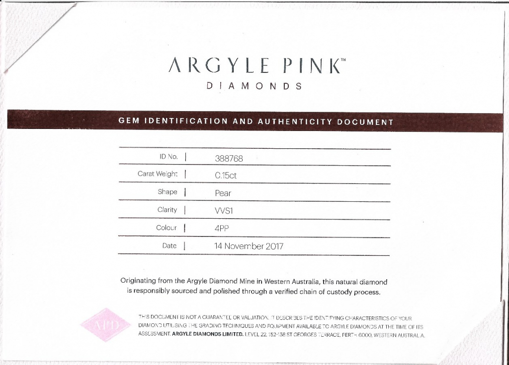 Certifikát ARGYLE je vystaven přímo diamantovým dolem v Austrálii, kde byl diamant vytěžen. Diamant je laserově číslován na své rundistě dolem ARGYLE.