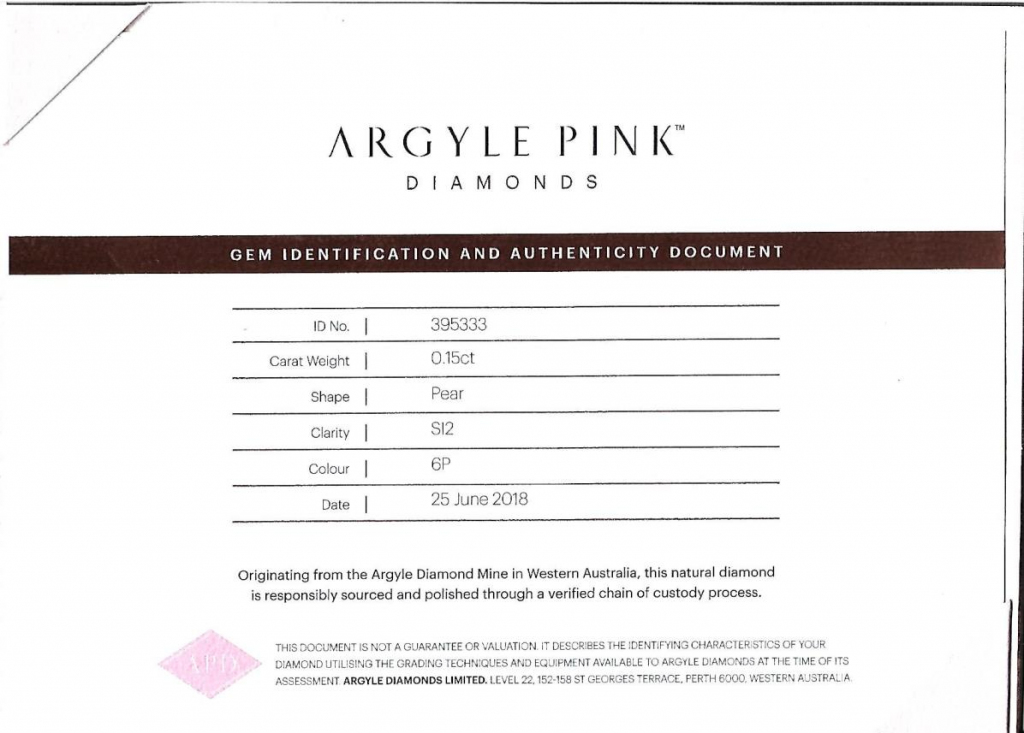 Certifikát ARGYLE je vystaven přímo diamantovým dolem v Austrálii, kde byl diamant vytěžen. Diamant je laserově číslován na své rundistě dolem ARGYLE.