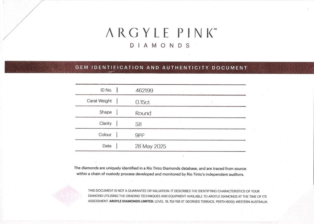 Certifikát ARGYLE je vystaven přímo diamantovým dolem v Austrálii, kde byl diamant vytěžen. Diamant je laserově číslován na své rundistě dolem ARGYLE.