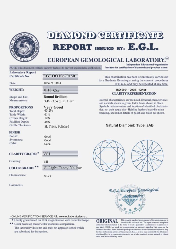 Diamant je včetně certifikátu EGL vydaným jedinou mezinárodně uznávanou gemologickou laboratoří sídlící ve východní Evropě – Praze.