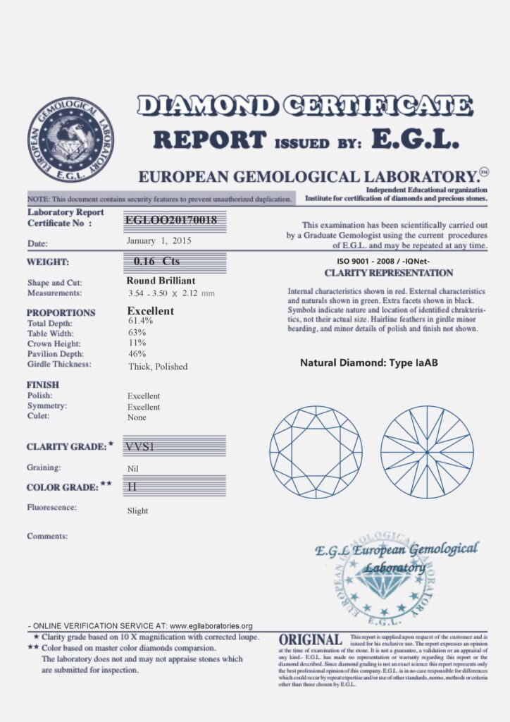 Diamant je včetně certifikátu EGL vydaným jedinou mezinárodně uznávanou gemologickou laboratoří sídlící ve východní Evropě – Praze.