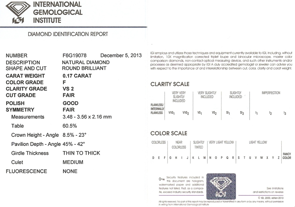 Diamant 0.17ct F/VS2 s IGI certifikátem