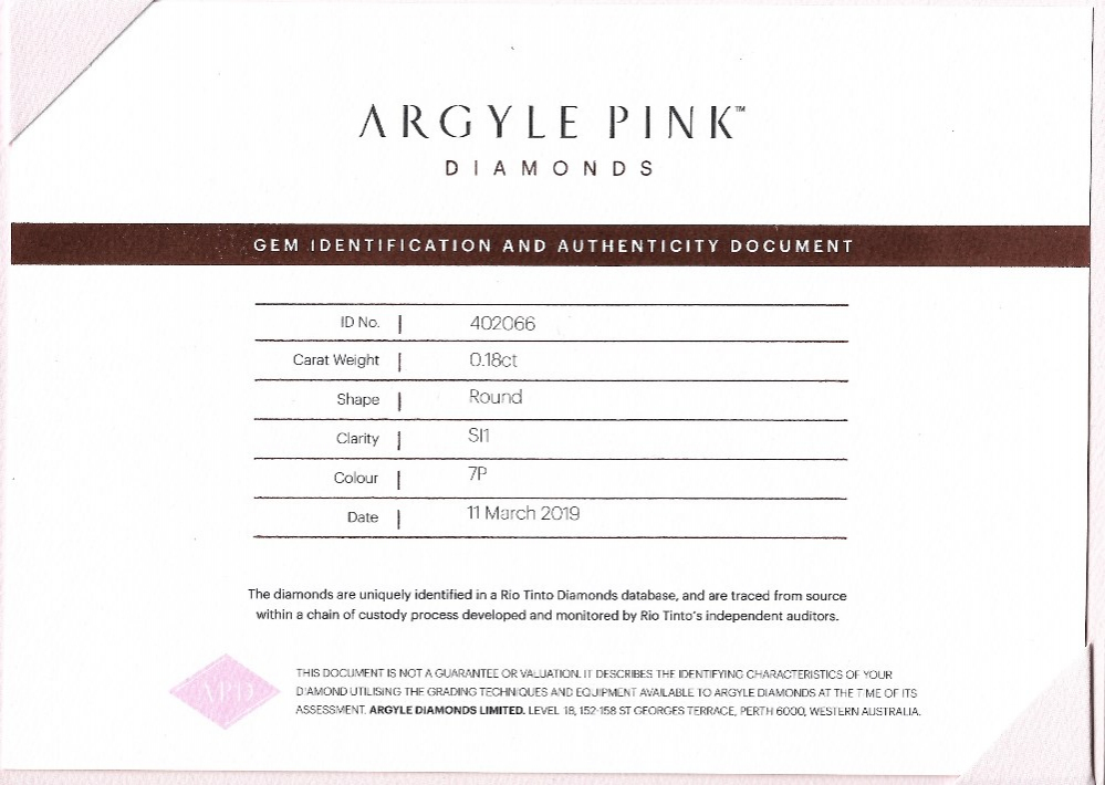 Certifikát ARGYLE je vystaven přímo diamantovým dolem v Austrálii, kde byl diamant vytěžen. Diamant je laserově číslován na své rundistě dolem ARGYLE.