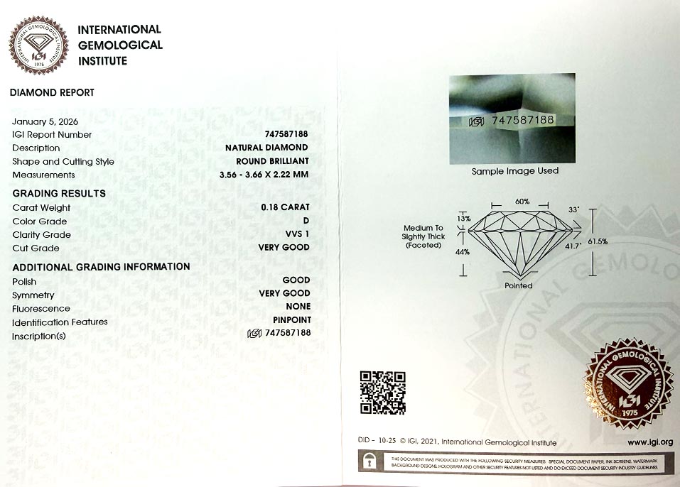 Diamant je včetně certifikátu IGI a je laserově číslován na své rundistě laboratoří IGI.