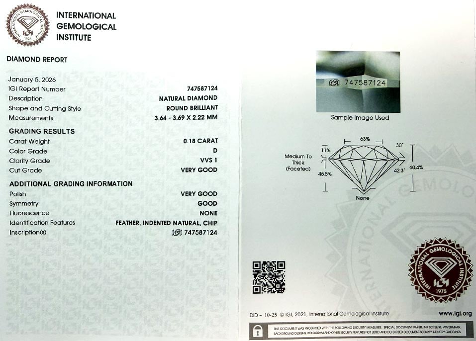Diamant je včetně certifikátu IGI a je laserově číslován na své rundistě laboratoří IGI.