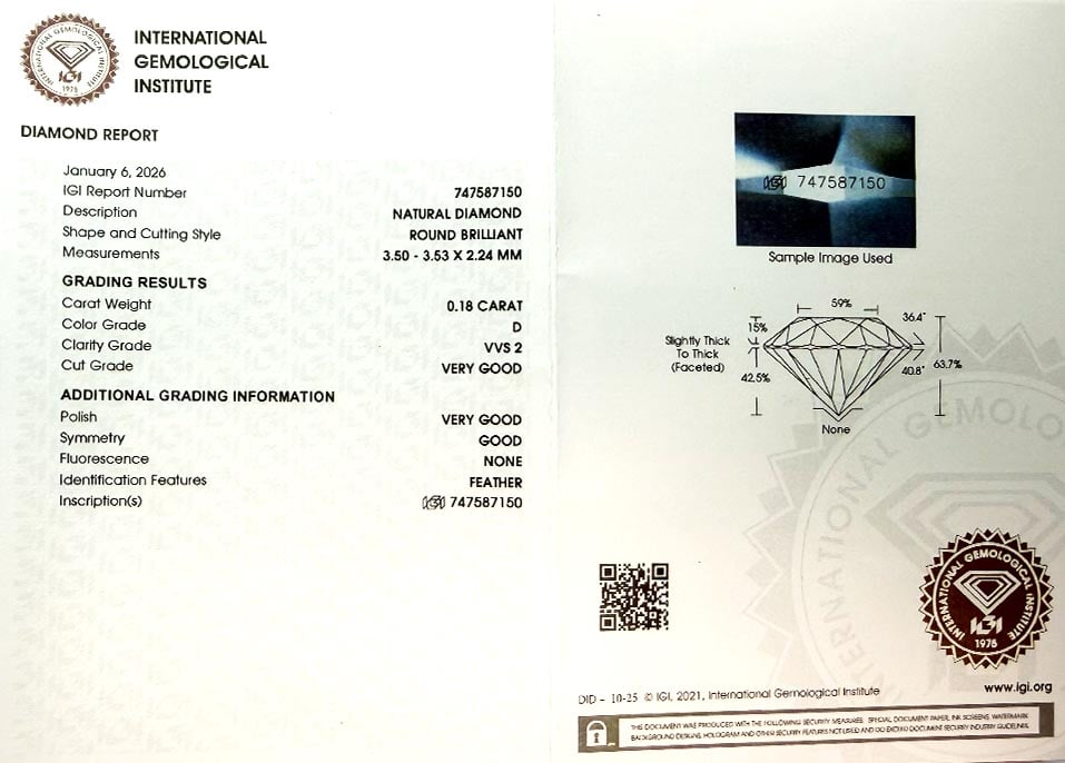 Diamant je včetně certifikátu IGI a je laserově číslován na své rundistě laboratoří IGI.