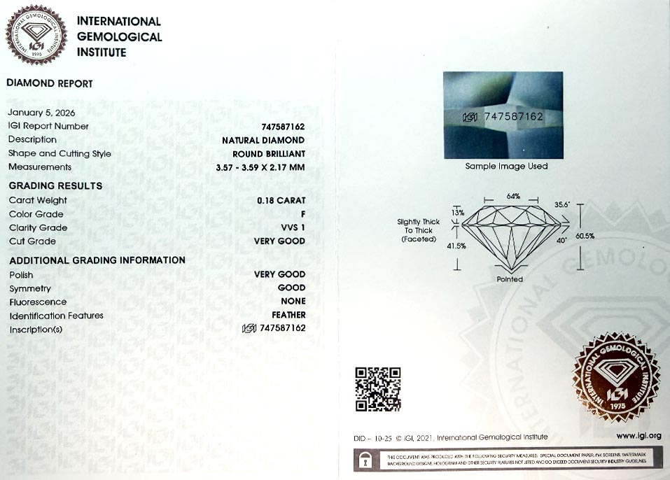 Diamant je včetně certifikátu IGI a je laserově číslován na své rundistě laboratoří IGI.