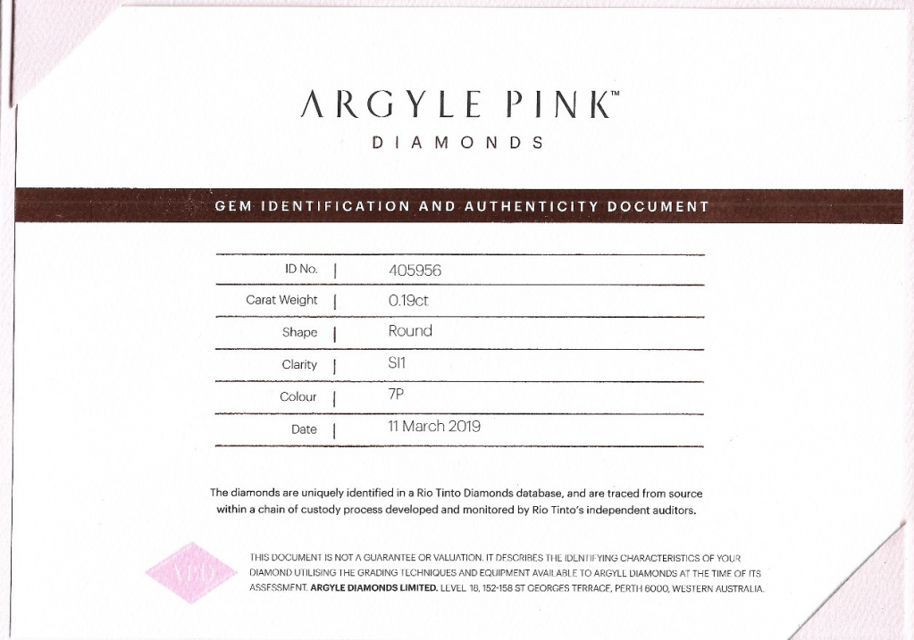 Certifikáty ARGYLE jsou unikátní tím, že potvrzují velmi ceněný australský původ růžových diamantů z věhlasného dolu Argyle. Certifikát vystavuje přímo diamantový důl a všechny diamanty jsou opatřeny jedinečným laserovým číslem na rundistě diamantu. Tyto certifikáty nabízejí velmi propracovaný systém hodnocení sytosti a odstínu barvy. Diamanty certifikované společností po roce 2008 lze verifikovat online.