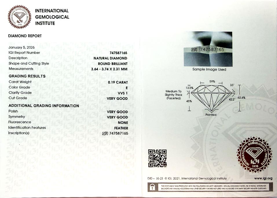 Diamant je včetně certifikátu IGI a je laserově číslován na své rundistě laboratoří IGI.