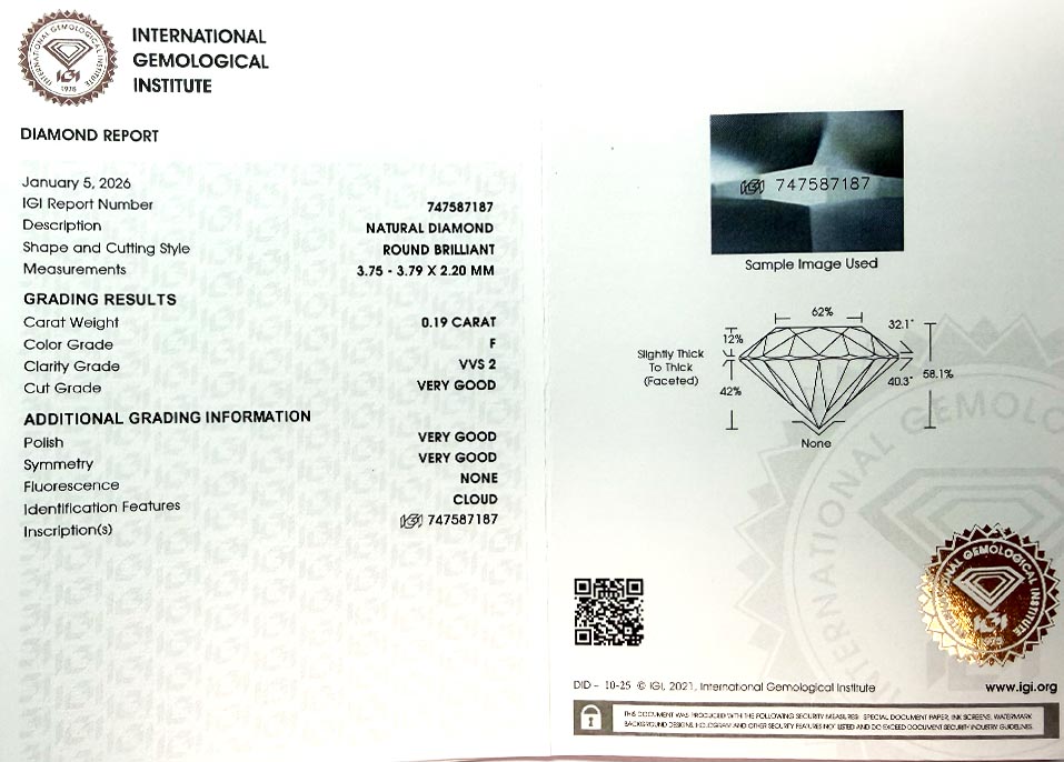 Diamant je včetně certifikátu IGI a je laserově číslován na své rundistě laboratoří IGI.