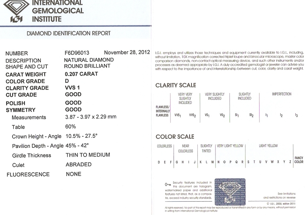 Diamant 0.207ct D/VVS1 s IGI certifikátem