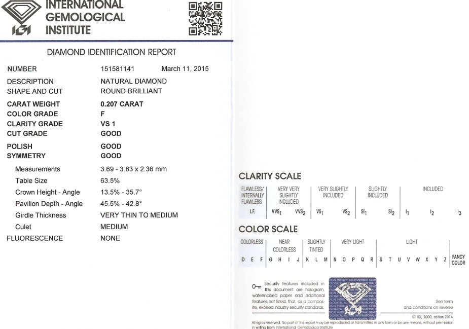 Diamant 0.207ct F/VS1 s IGI certifikátem