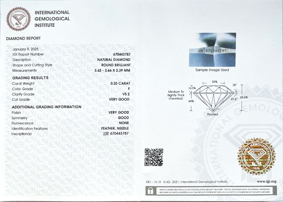 Diamant je včetně certifikátu IGI a je laserově číslován na své rundistě laboratoří IGI.