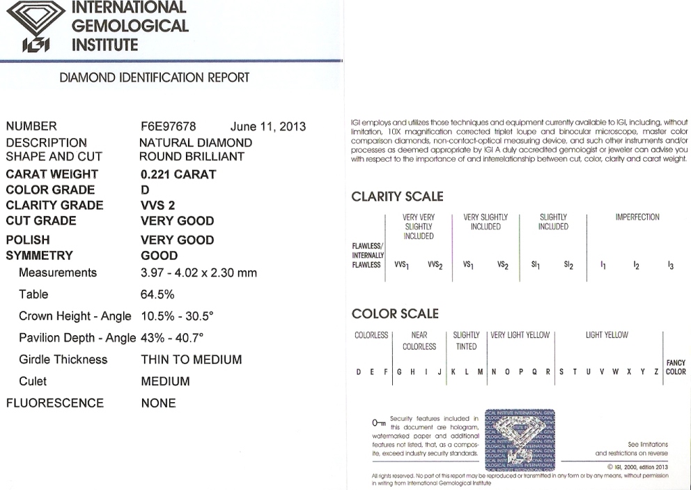 Diamant 0.221ct D/VVS2 s IGI certifikátem