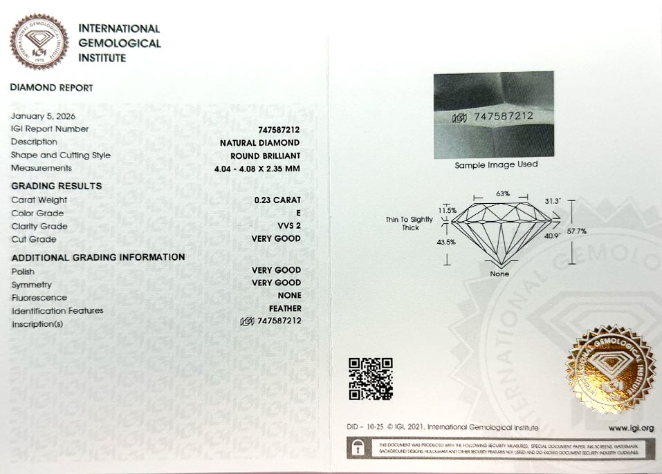 Diamant je včetně certifikátu IGI a je laserově číslován na své rundistě laboratoří IGI.