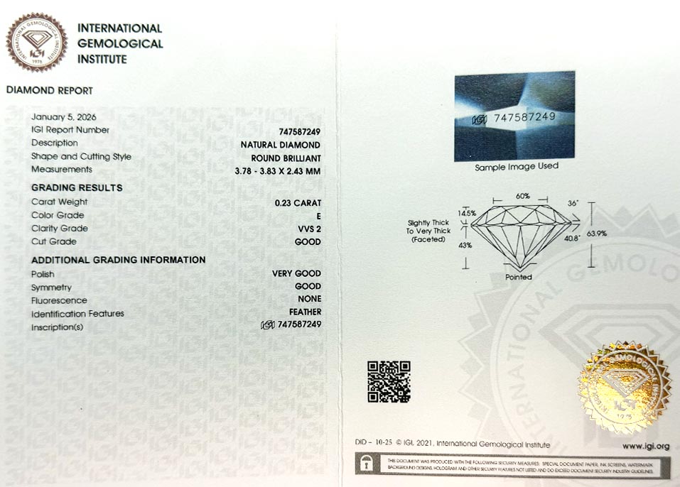 Diamant je včetně certifikátu IGI a je laserově číslován na své rundistě laboratoří IGI.