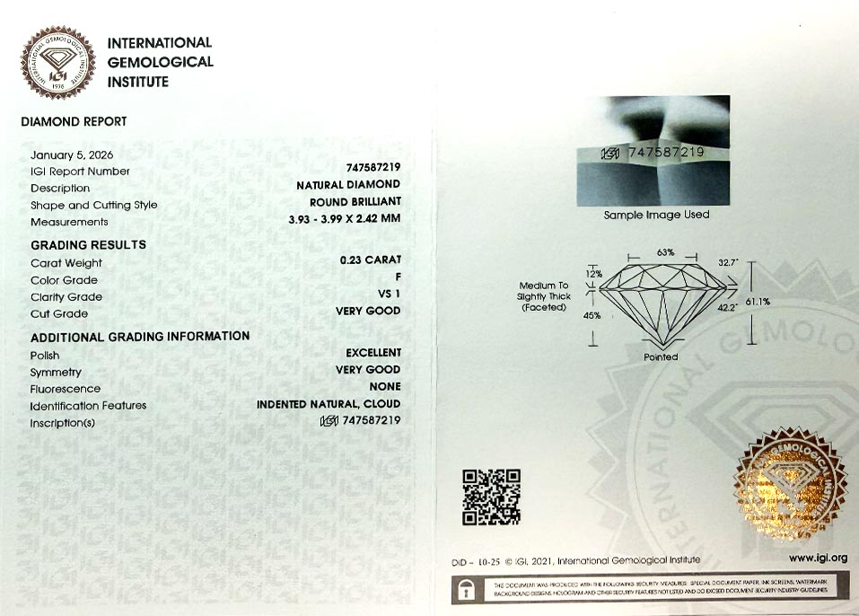 Diamant je včetně certifikátu IGI a je laserově číslován na své rundistě laboratoří IGI.