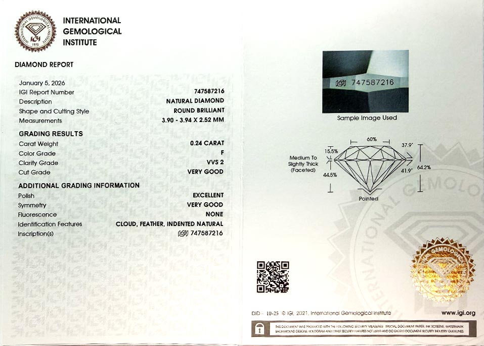 Diamant je včetně certifikátu IGI a je laserově číslován na své rundistě laboratoří IGI.