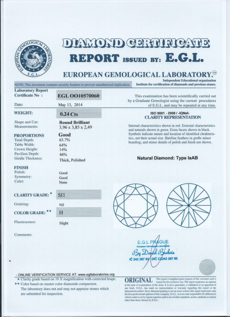 Diamant 0.24ct H/SI1 s EGL certifikátem