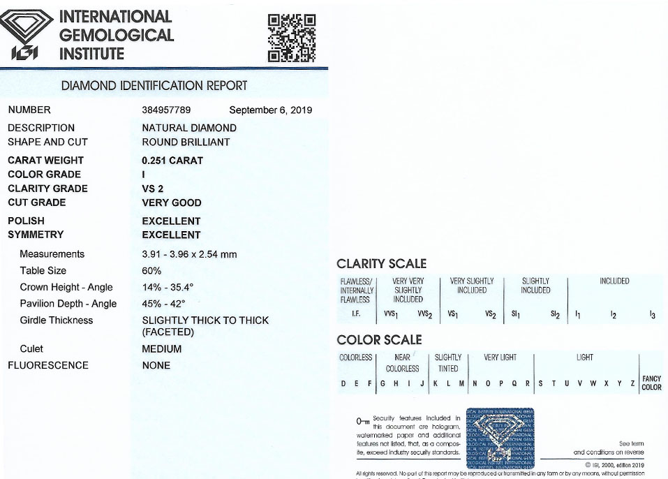 Diamant 0.251ct I/VS2 s IGI certifikátem