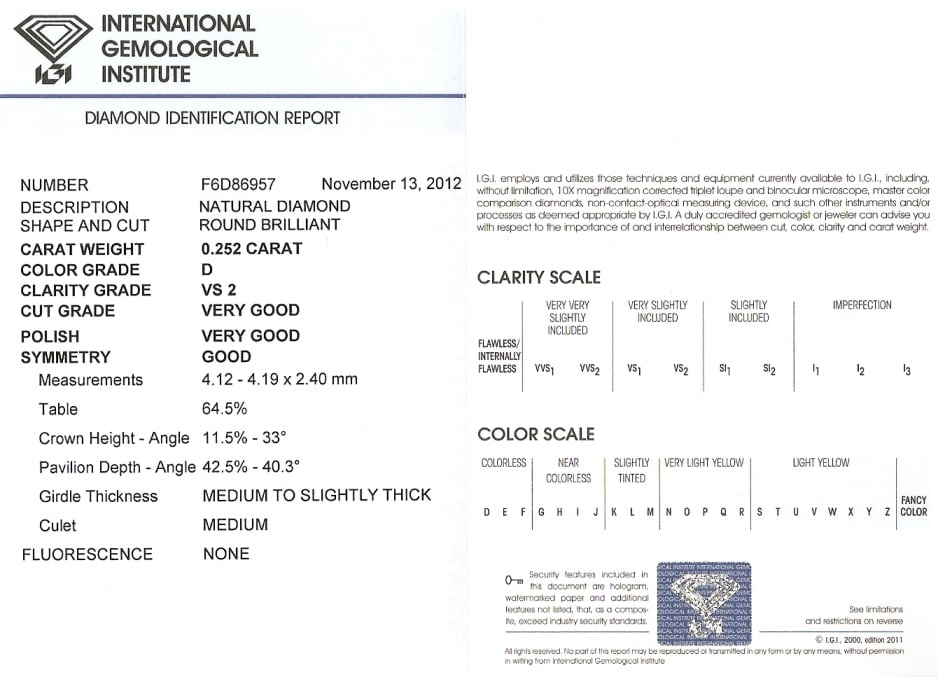 Diamant 0.252ct D/VS2 s IGI certifikátem