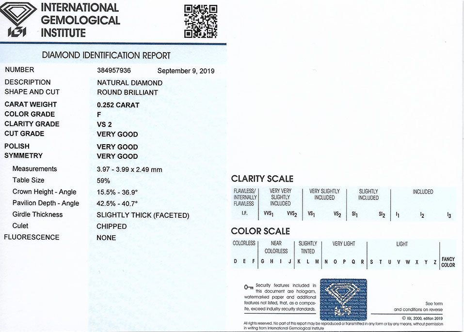 Diamant 0.252ct F/VS2 s IGI certifikátem