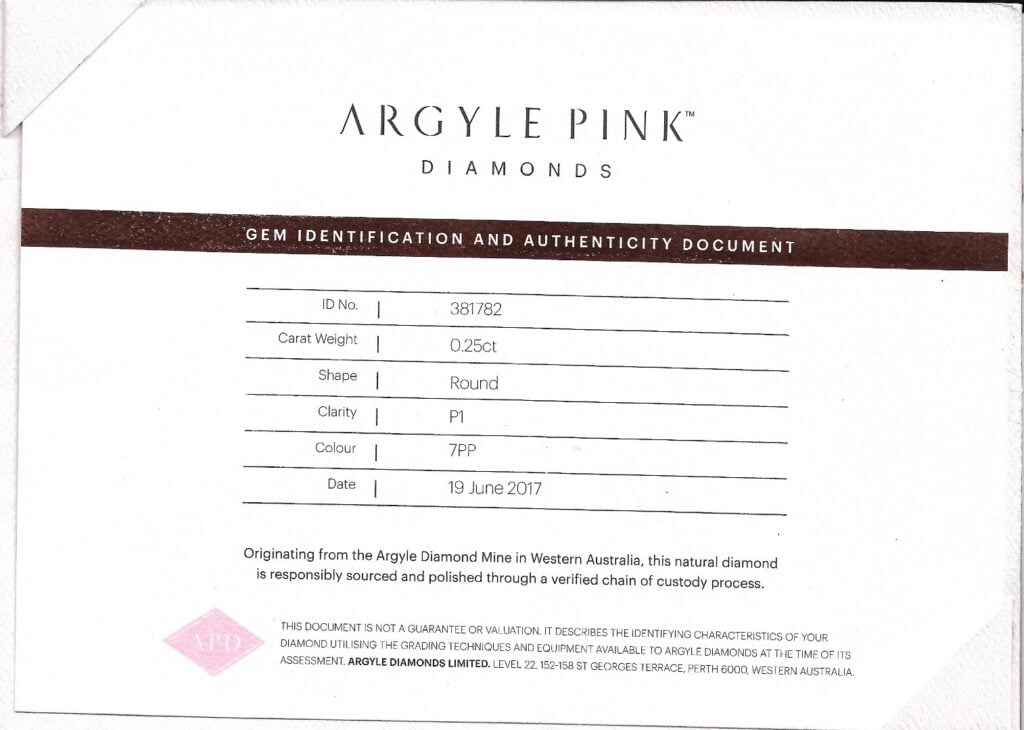 Certifikát ARGYLE je vystaven přímo diamantovým dolem v Austrálii, kde byl diamant vytěžen. Diamant je laserově číslován na své rundistě dolem ARGYLE.