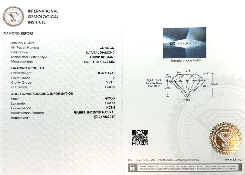 Diamant je včetně certifikátu IGI a je laserově číslován na své rundistě laboratoří IGI.
