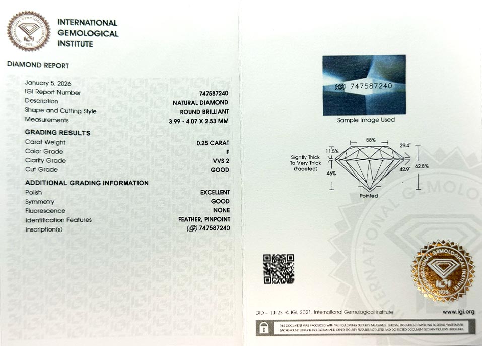 Diamant je včetně certifikátu IGI a je laserově číslován na své rundistě laboratoří IGI.