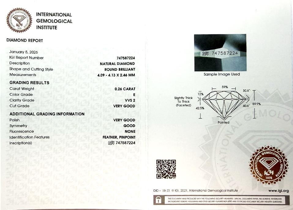 Diamant je včetně certifikátu IGI a je laserově číslován na své rundistě laboratoří IGI.
