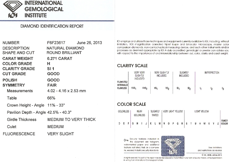 Diamant 0.271ct H/SI1 s IGI certifikátem