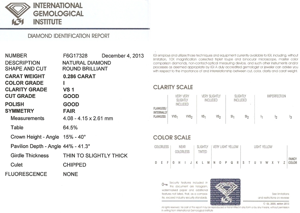 Diamant 0.286ct I/VS1 s IGI certifikátem