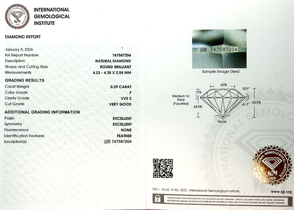 Diamant je včetně certifikátu IGI a je laserově číslován na své rundistě laboratoří IGI.