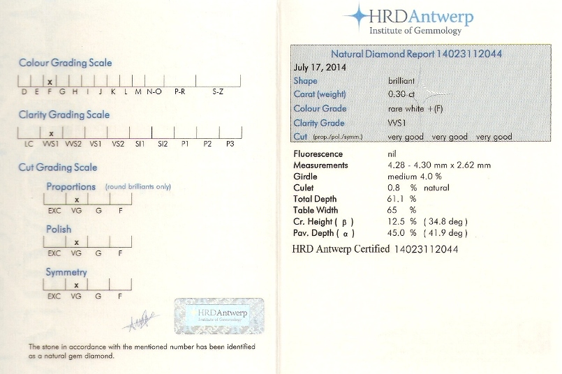 (Hooge Raad voor Diamant) z Belgie. Je jednou z nejvíce ceněných gemologických laboratoří. Byla založena v roce 1973 a striktně se drží pravidel stanových Diamond High Council. Všechny námi nabízené diamanty opatřeny HRD certifikátem, lze verifikovat na stránkách HRD. Většina diamantů je zatavena do plastové kartičky, pro větší bezpečnost nákupu.