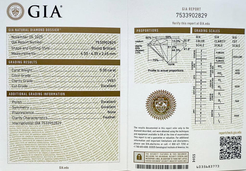 byl založen v roce 1931 a patří k absolutní špičce mezi gemologickými laboratořemi po celém světě a dodržuje pravidla stanovená Diamond High Council v plném rozsahu. Všechny diamanty na stránkách VVDiamonds opatřeny certifikátem GIA, lze verifikovat na stránkách GIA. Většina diamantů je laserově číslována pro větší bezpečnost obchodu.