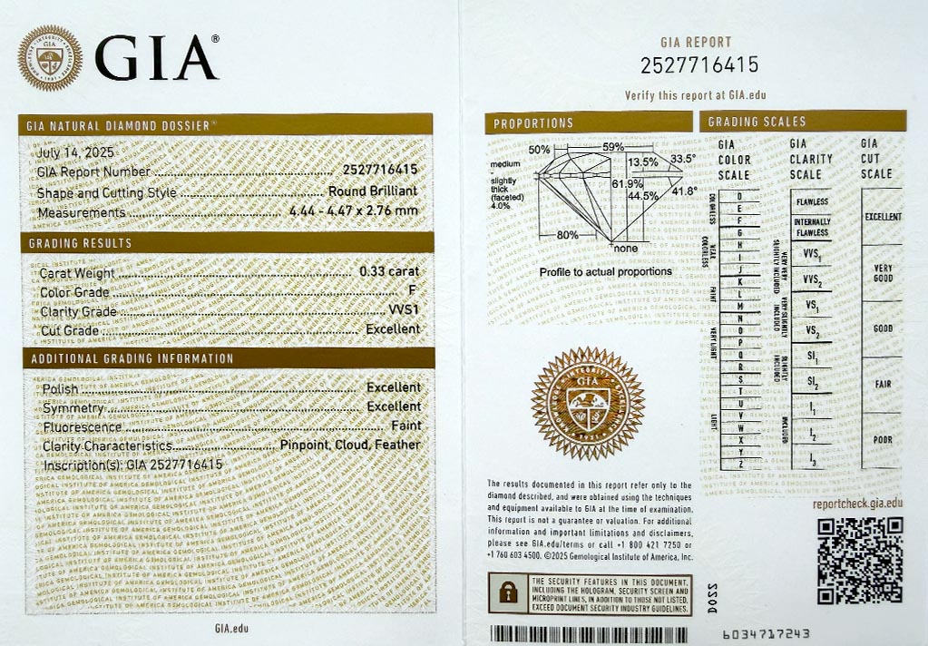 byl založen v roce 1931 a patří k absolutní špičce mezi gemologickými laboratořemi po celém světě a dodržuje pravidla stanovená Diamond High Council v plném rozsahu. Všechny diamanty na stránkách VVDiamonds opatřeny certifikátem GIA, lze verifikovat na stránkách GIA. Většina diamantů je laserově číslována pro větší bezpečnost obchodu.