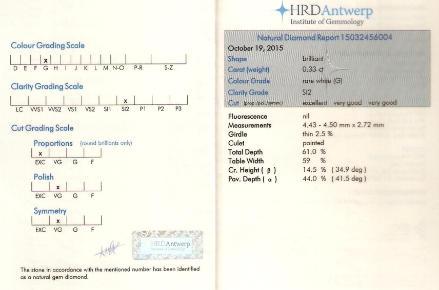 (Hooge Raad voor Diamant) z Belgie. Je jednou z nejvíce ceněných gemologických laboratoří. Byla založena v roce 1973 a striktně se drží pravidel stanových Diamond High Council. Všechny námi nabízené diamanty opatřeny HRD certifikátem, lze verifikovat na stránkách HRD. Většina diamantů je zatavena do plastové kartičky, pro větší bezpečnost nákupu.