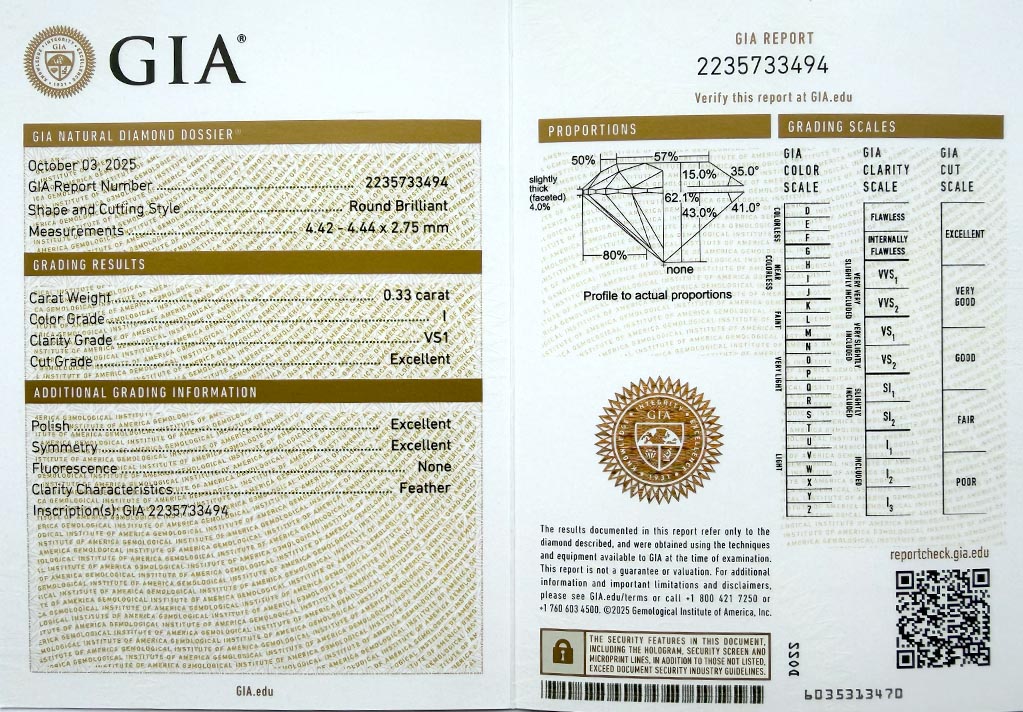 Diamant je včetně certifikátu GIA a je laserově číslován na své rundistě laboratoří GIA.