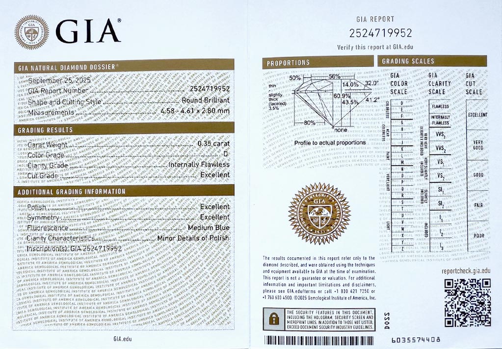 Diamant je včetně certifikátu GIA a je laserově číslován na své rundistě laboratoří GIA.