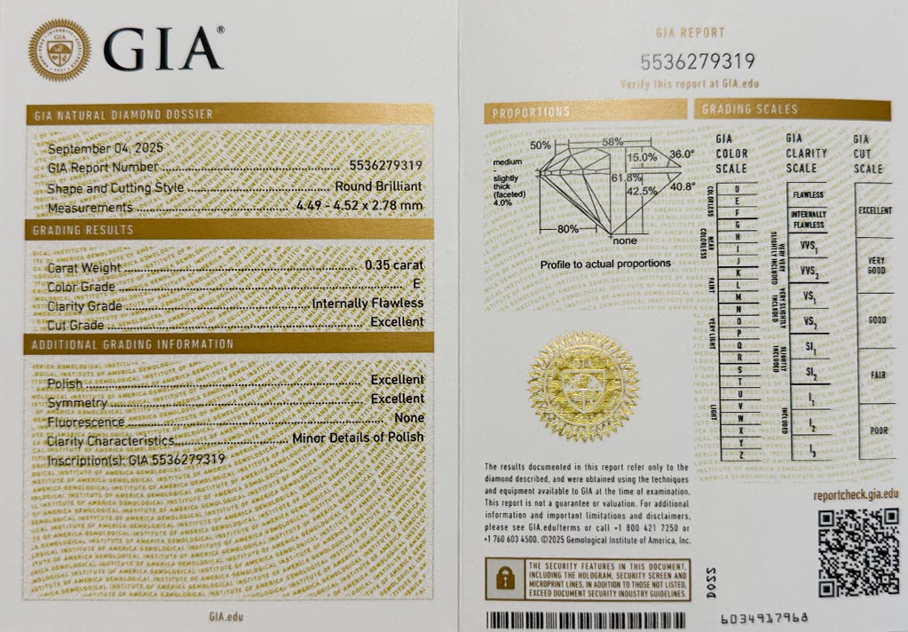 Diamant je včetně certifikátu GIA a je laserově číslován na své rundistě laboratoří GIA.