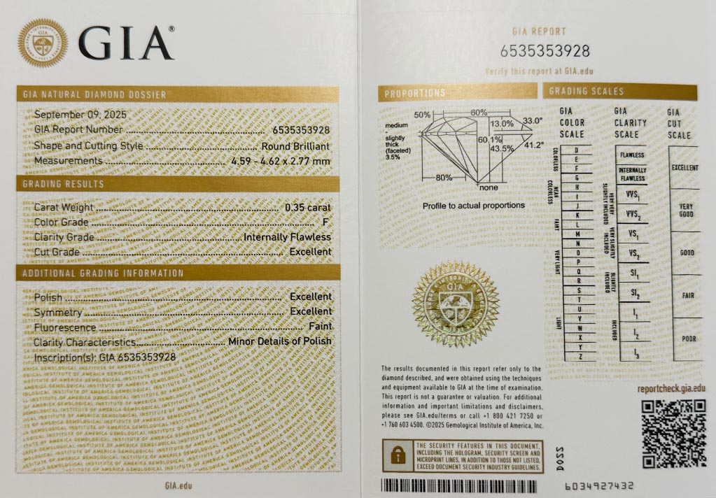 Diamant je včetně certifikátu GIA a je laserově číslován na své rundistě laboratoří GIA.