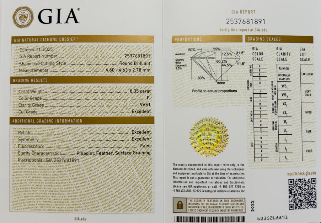 Diamant je včetně certifikátu GIA a je laserově číslován na své rundistě laboratoří GIA.