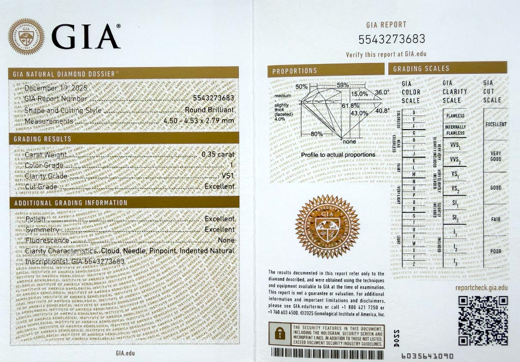 Diamant je včetně certifikátu GIA a je laserově číslován na své rundistě laboratoří GIA.